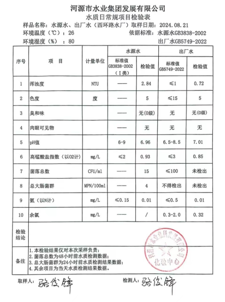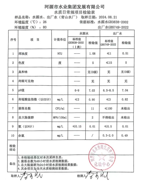 2024年8月21日水質(zhì)檢驗(yàn)報告