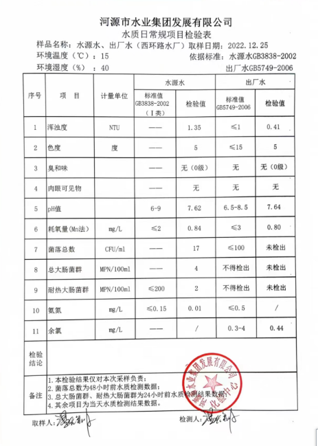 2022年12月25日水質(zhì)檢驗報告