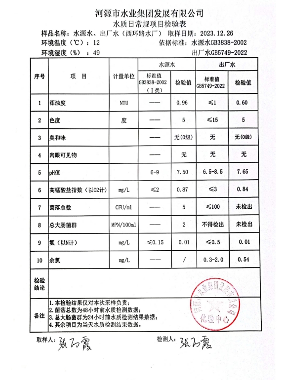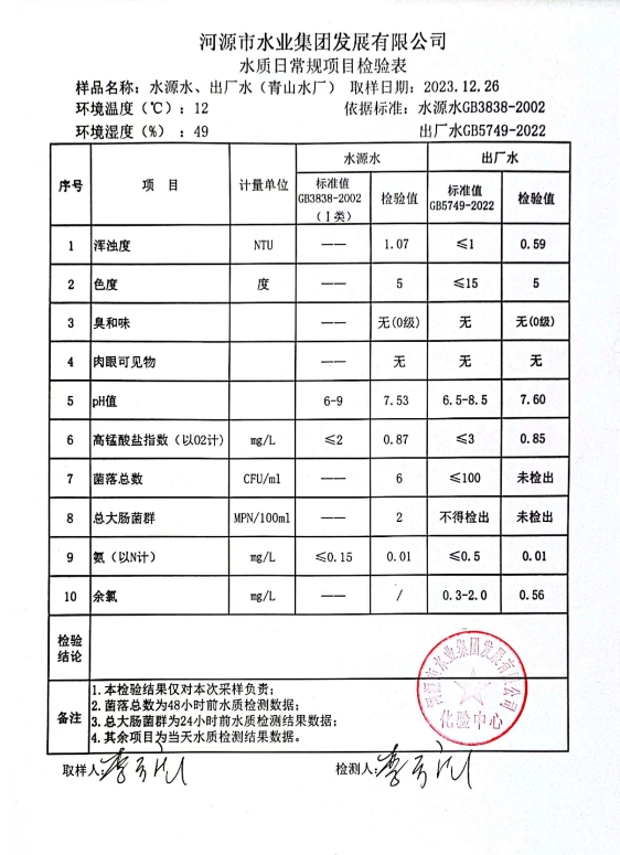2023年12月26日水質(zhì)檢驗(yàn)報(bào)告