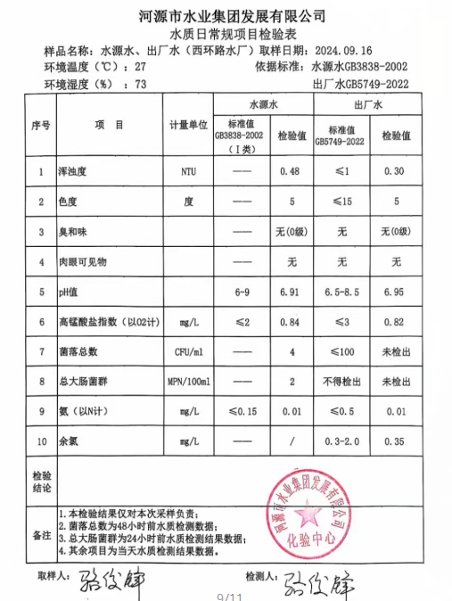 2024年9月16日水質(zhì)檢驗(yàn)報(bào)告
